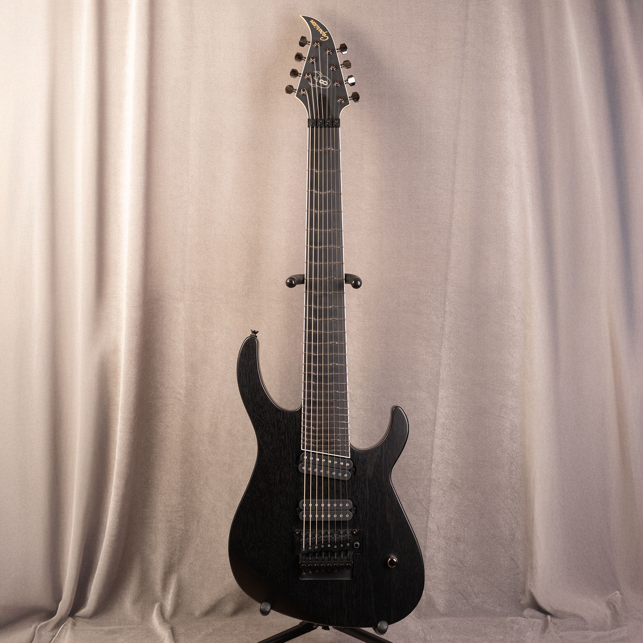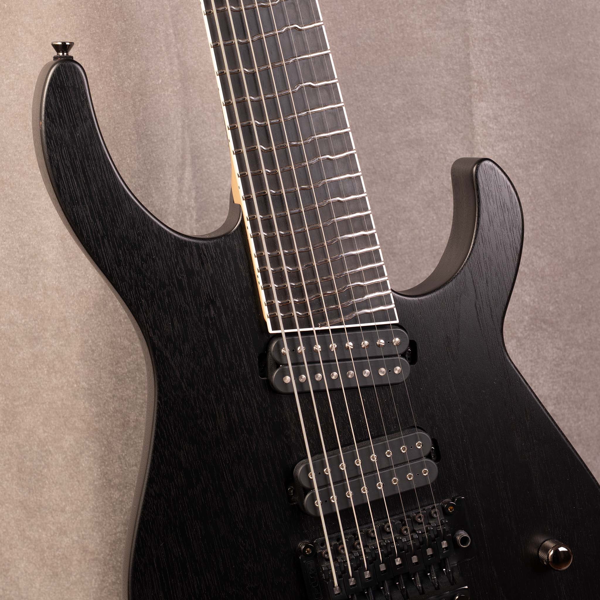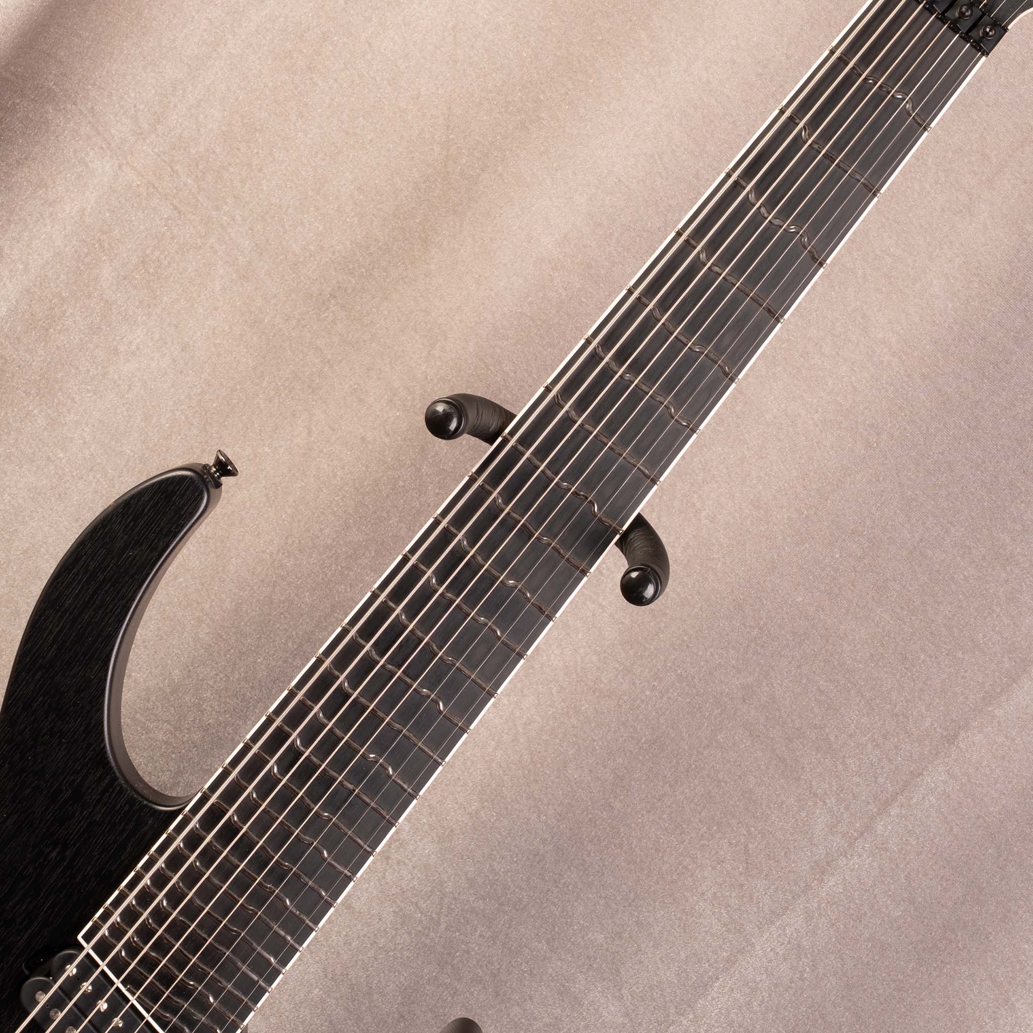 8弦にして27フレット、685.8mm(27inch.)の長いネックスケール、そしてギターとベースが同居したようなチューニングというマティアス(Mattias “IA” Eklundh)からの要求を具現化した非対称ボディデザイン。高音域から低音域までバランス良いサウンドで実績のある、”WM”ボディ構造(ウォルナット・トップ、マホガニー・バック)によって、8弦の強力な重低音から、1弦の27フレットの超高音までバランス良く出力します。