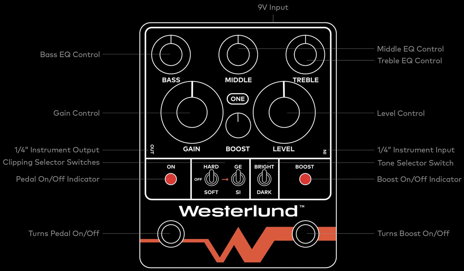 3つのユニークなモード(オフまたは“アンプモード”、ハード、ソフト)、ゲルマニウム/シリコンクリッピング、プレゲインブースト、3バンドEQ、十分なヘッドルームを備え、ONE は透明感のあるトーンから真空管サチュレーションのようなサウンドまで幅広くカバー。