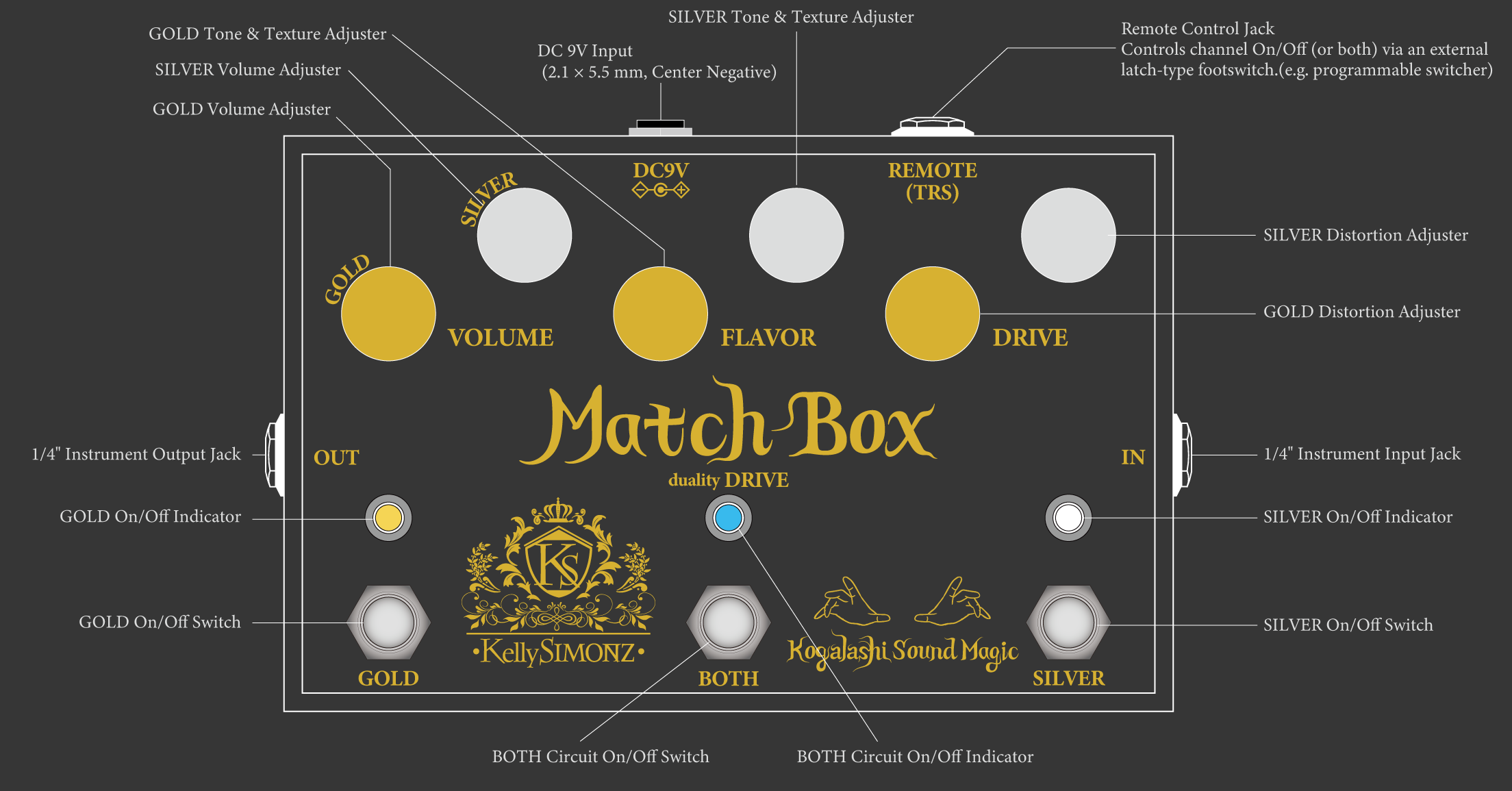 通常のMatchBoxには「RED」と「GOLD」の2つの独立したオーバードライブ回路で構成されていますが、Special Edition版の本製品は「RED」をKelly SIMONZ氏のプレイに合わせて微調整した「SILVER」へ変更。